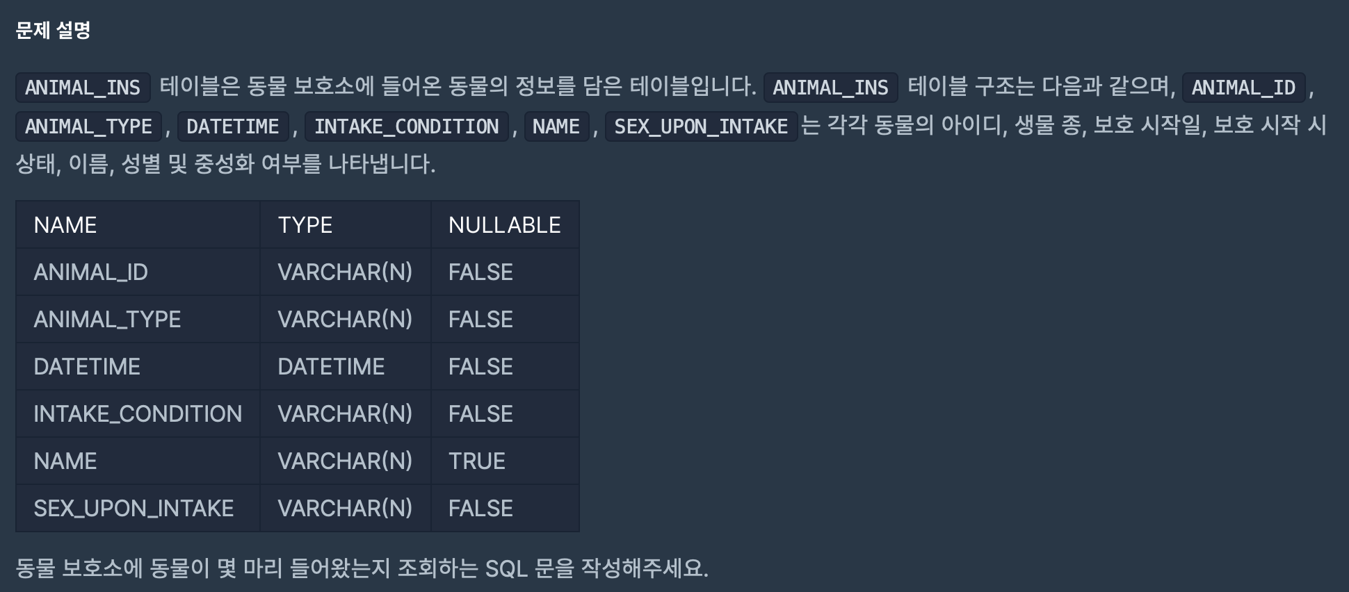 [문제1] ANIMAL_INS 테이블은 동물 보호소에 들어온 동물의 정보를 담은 테이블이다.