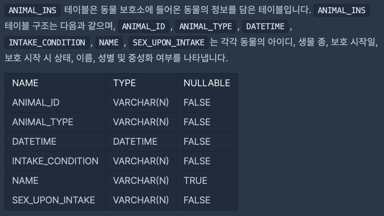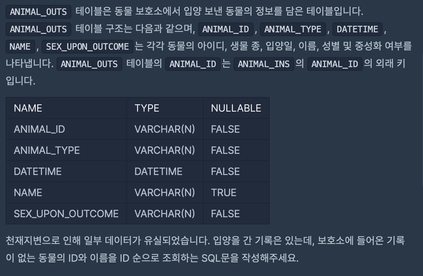 [문제] ANIMAL_INS 테이블은 동물 보호소에 들어온 동물의 정보를 담은 테이블이고, ANIMAL_OUTS 테이블은 동물 보호소에서 입양 보낸