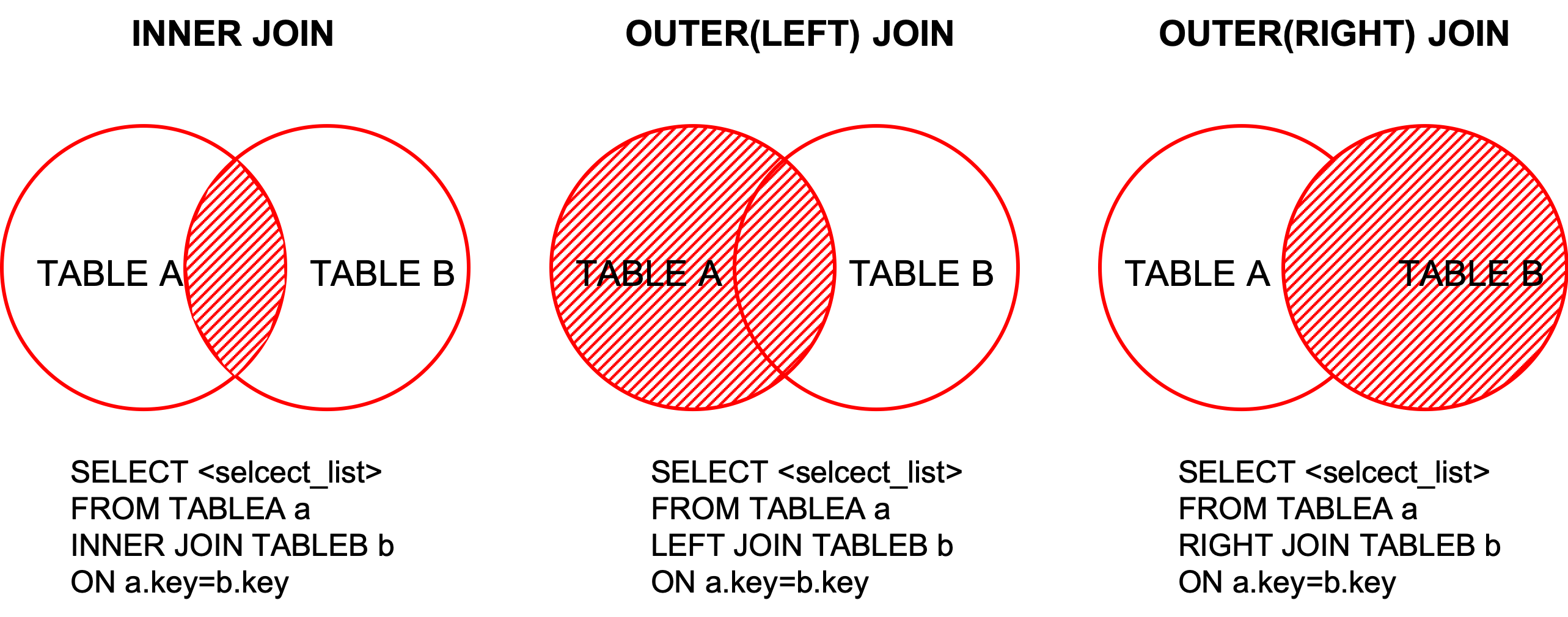 예를 들면, TABLEA LEFT JOIN TABLEB일 경우 TABLEA의 결과는 모두 노출하고 A와 교집합이 있는 B만 추가로 추출한다는 뜻이에요.