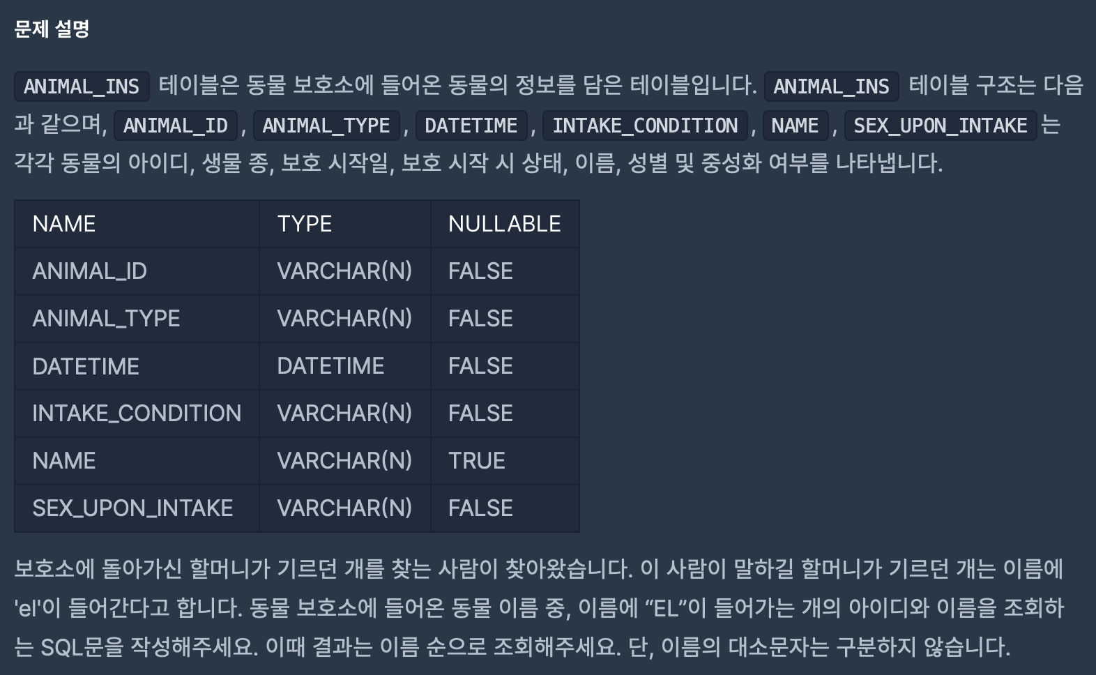 [문제] ANIMAL_INS 테이블은 동물 보호소에 들어온 동물의 정보를 담은 테이블이다. 보호소에 돌아가신 할머니 기르던 개를 찾는 사람이 찾아왔다. 이 사람이 말하길 할머니가 기르던 개는 이름에 'el'이 들어간다고 합니다. 동물 보호소에 들어온 동물 이름 중, 이름에 'EL'이 들어가는 개의 아이디와 이름을 조회하는 SQL문을 작성해주세요. 단, 결과는 이름 순으로 조회하며 이름의 대소문자는 구분하지 않습니다.