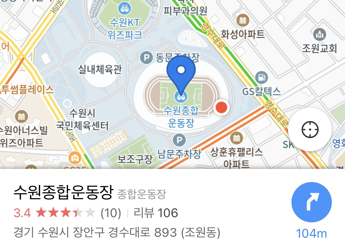 수원FC 홈구장은 이름에 맞게 수원시 장안구에 위치한 수원종합운동장으로 KT위즈파크와 함께 위치해있어요