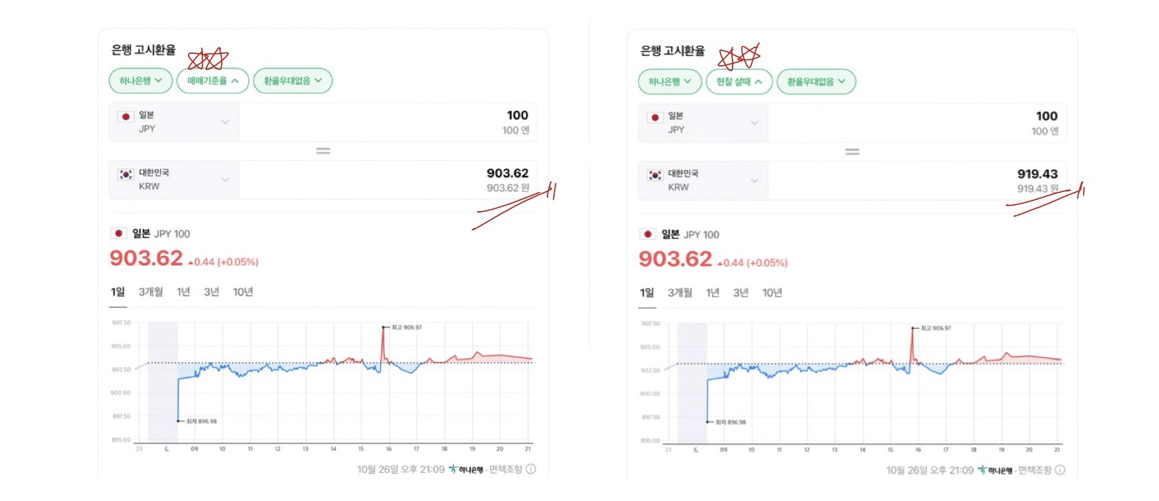 이 “현찰 살때”의 금액이 오늘 날짜에 진행되는 환전의 기준 금액이 되는거죠 :)