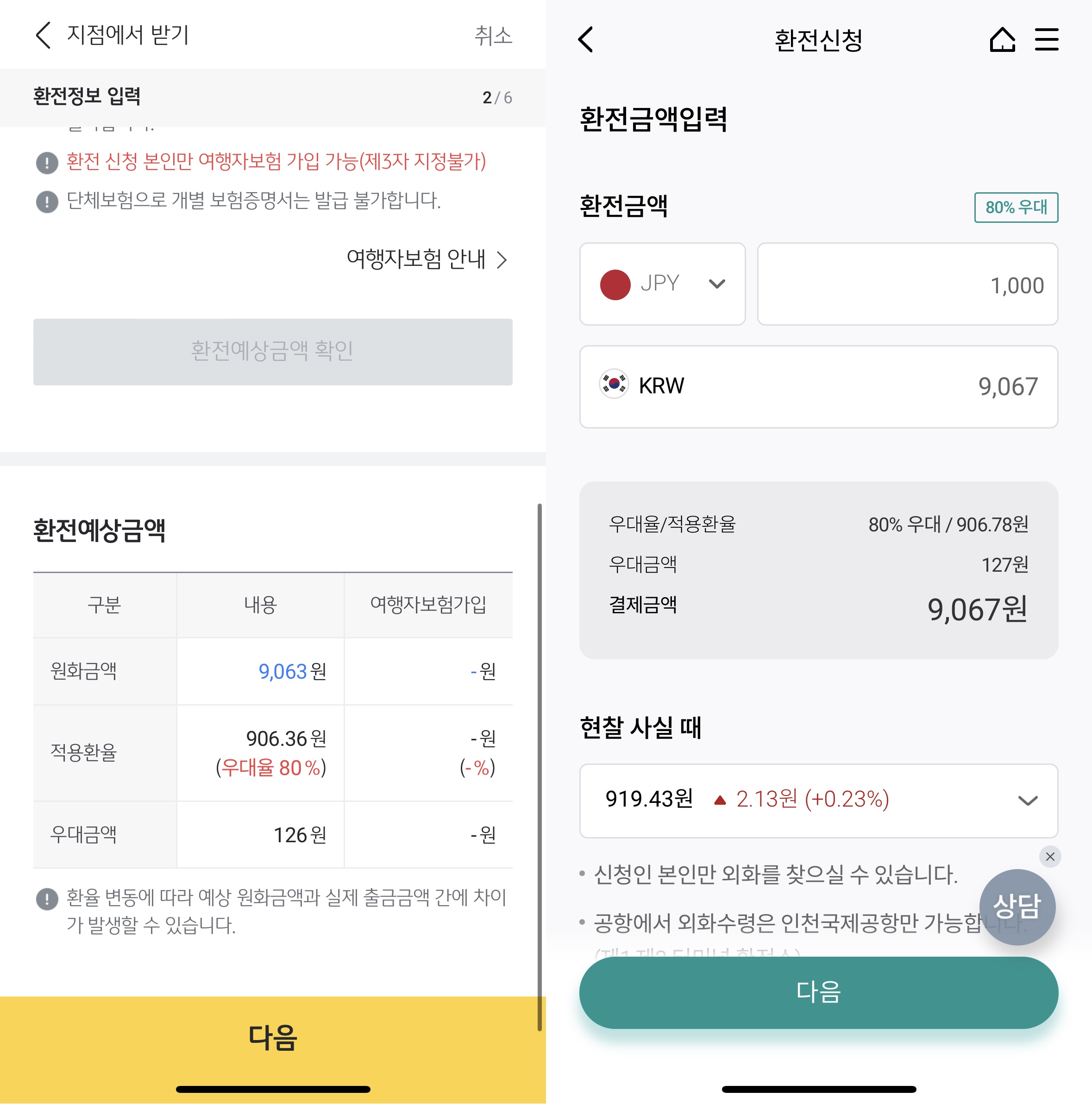 둘 은행 모두 80% 환율우대를 받을 수 있었고, 각각 906.36원 906.78원으로 기준시세보다는 확실히 싸네요!!