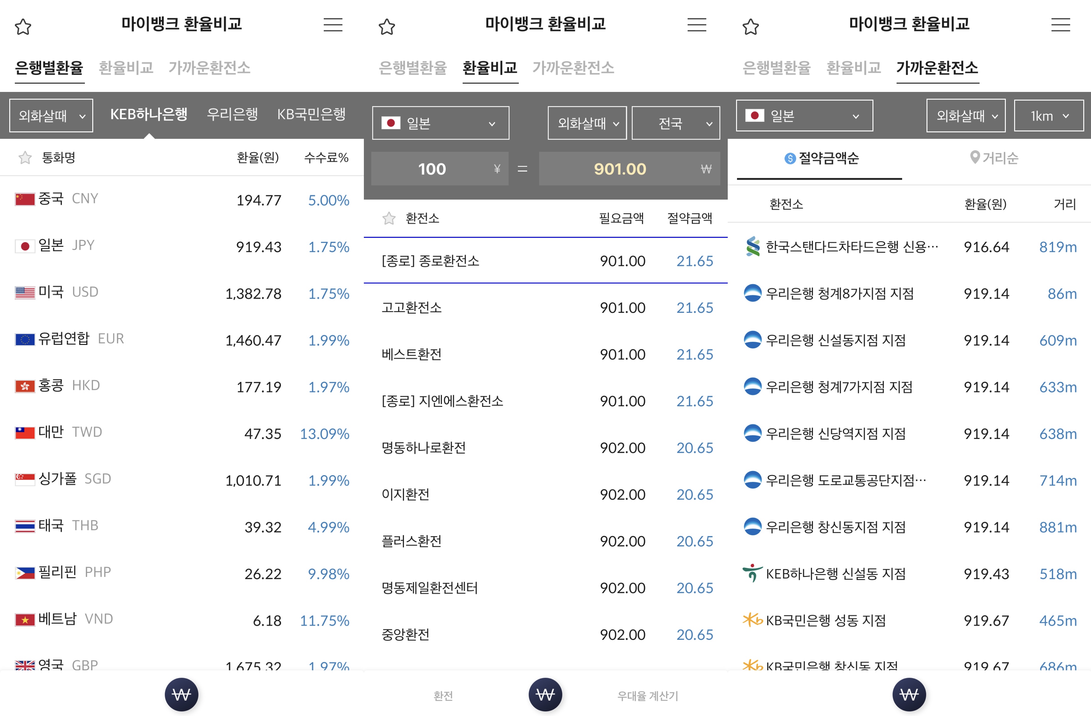 마이뱅크 앱은 사설환전소와 은행환율을 비교하고 가장 저렴한 환전소를 찾을 수 있다는 장점이 있어요(+환전 수수료도 절약!)
