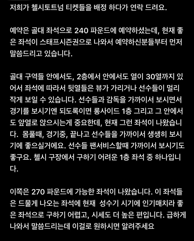 첼시토트넘은 위치에 따라 350~850파운드라고해요