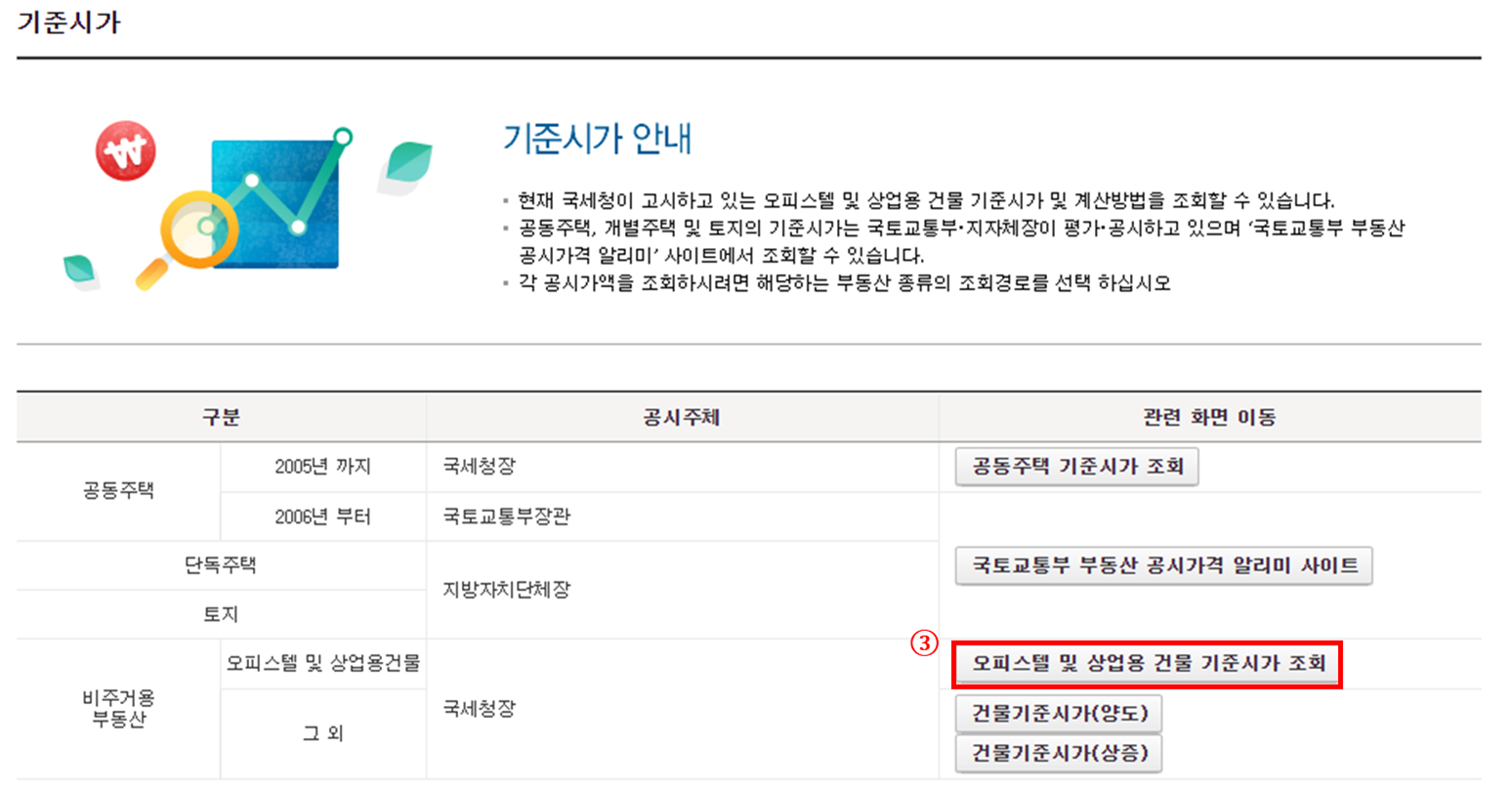 이에 '오피스텔 및 상업용 건물 기준시가 조회' 고고