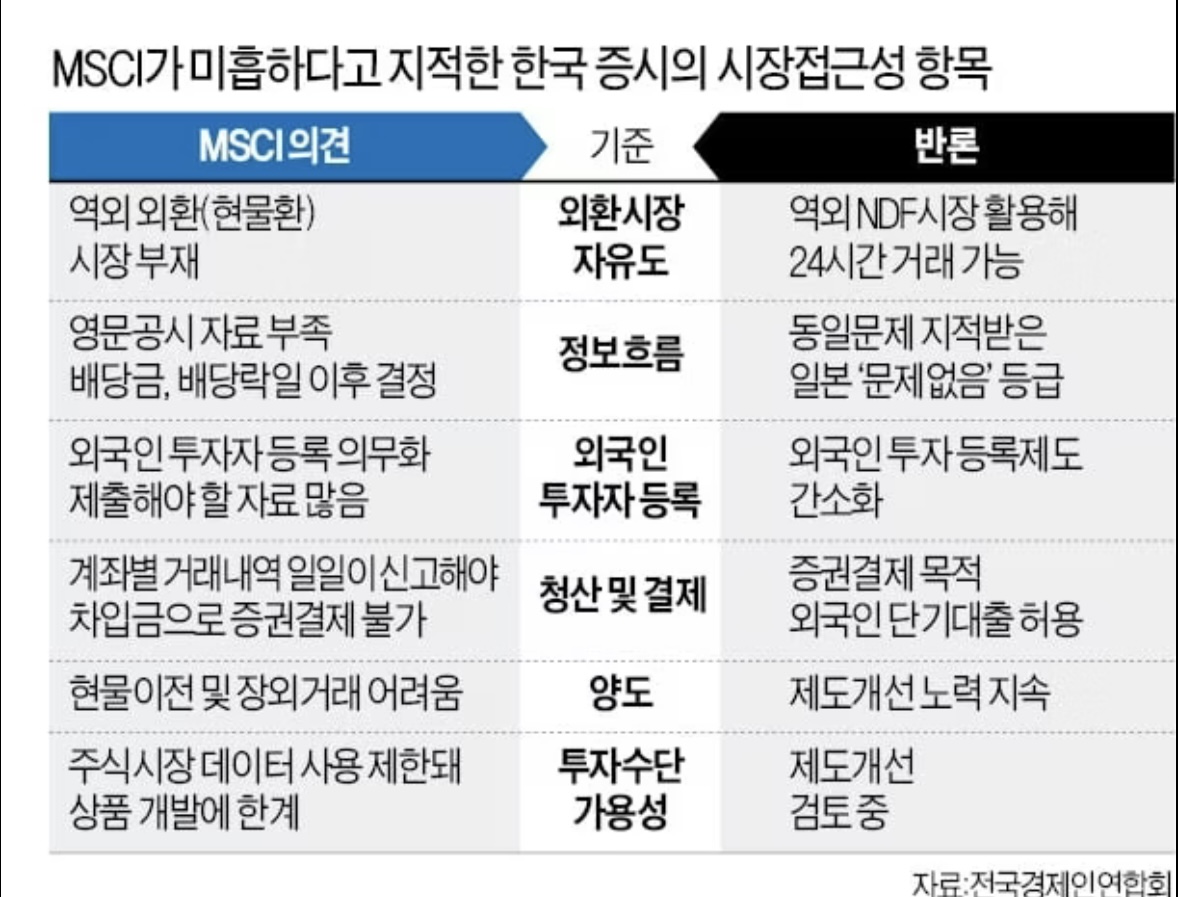 MSCI는 매년 각국의 시장 접근성, 외환시장 개방, 외국인 투자자 편의성, 정보 공개 등 다양한 기준을 평가해 선진국·신흥국을 분류합니다. 올해도 한국은 공매도 금지 해제, 외환시장 거래시간 연장 등 일부 개선이 있었지만, 여전히 외환시장 자유화 미흡, 외국인 투자자 등록 절차의 운영상 어려움, 영어 공시 부족 등이 문제로 지적됐습니다.