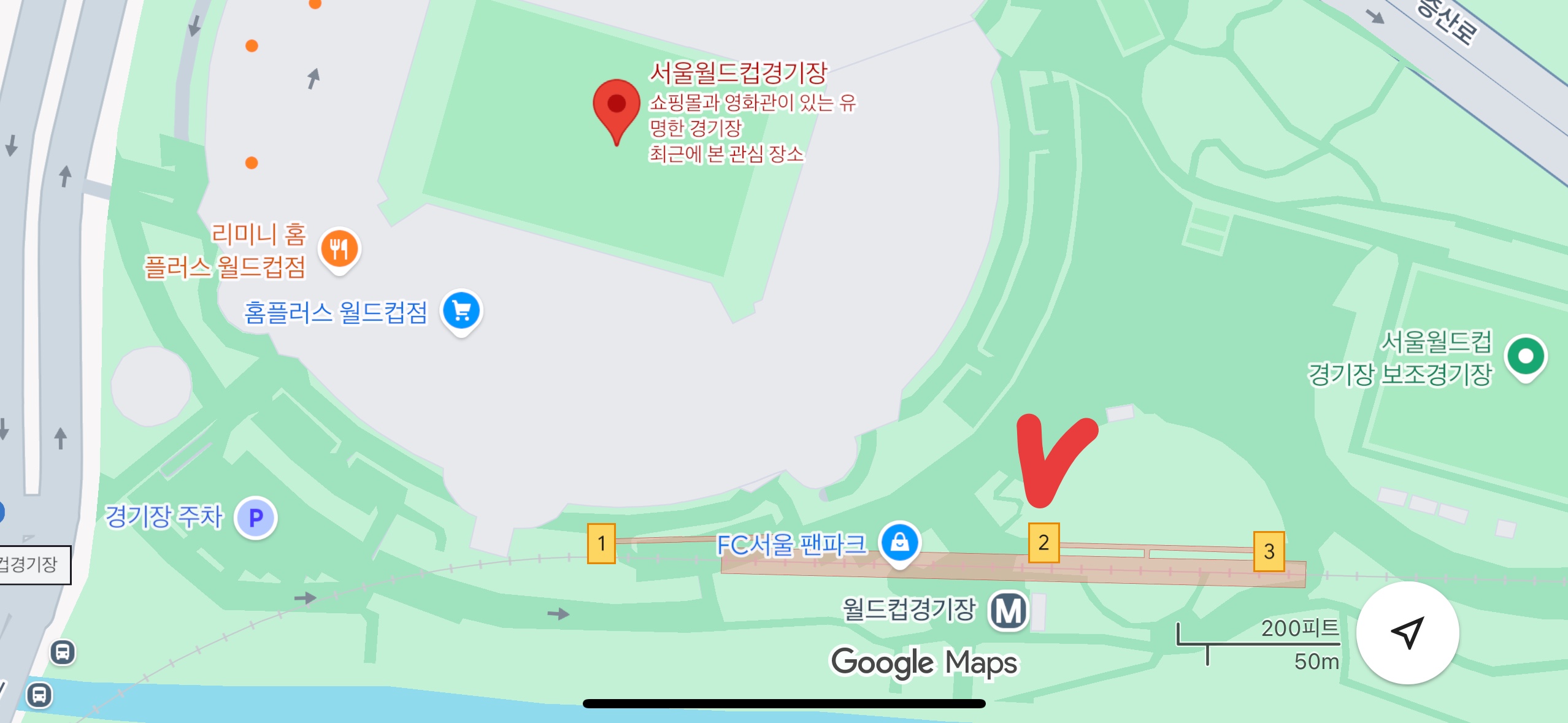 1번출구가 가까워보일 수 있지만, 경기장으로 향하는 광장이 2번출구와 가까워요.