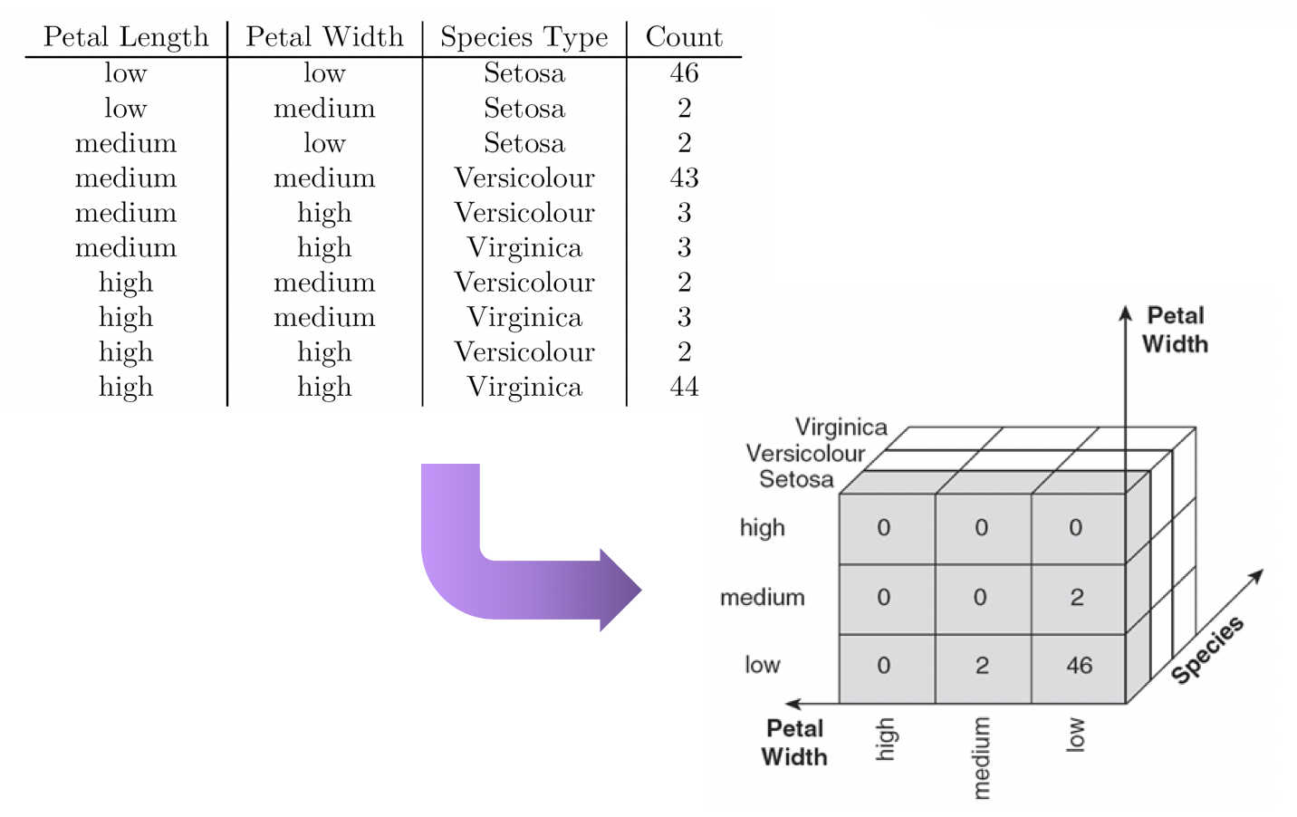 다차원 배열의 값, 축의 값으로 사용 할 타겟 속성들을 정함 (여기서 속성의 수가 다차원 배열의 차원을 결정함)