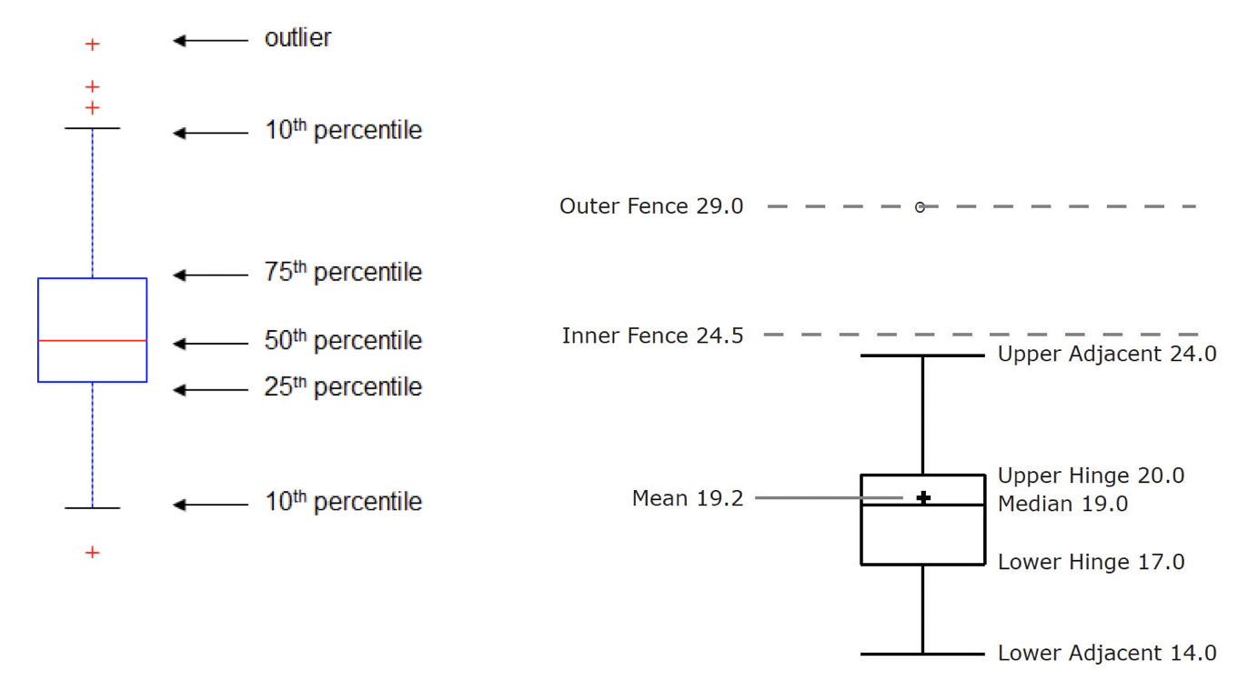 아래 그림의 왼쪽 상자의 하단과 상단의 끝은 각각 25번째, 75번째 백분위 값을 의미하며 outlier(이상치)는 '+'로 표시 되었다.